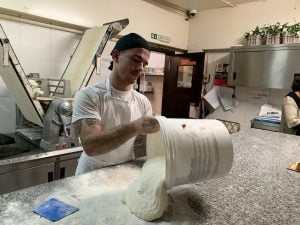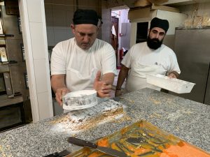 Na bancada de pedra o padeiro dá voltas à massa… estica de um lado, estica do outro, corta aqui e ali vários quadros que estão prontos a entrar no forno. Daniel explica-nos que não se trata de um pão comum, tem características que o distinguem dos demais.